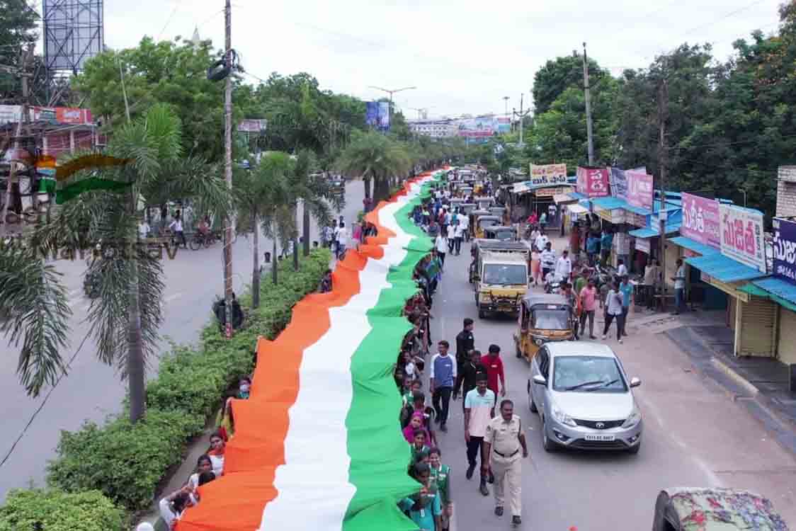 స్వతంత్ర భారత్ వజ్రోత్సవాల్లో భాగంగా 75 స్వాతంత్ర దినోత్సవాలను పూర్తిచేసుకుని 76వ సంవత్సరంలోని వెళ్తున్న సందర్భంగా కర్నూలులోని యువకులు డి.నిఖిల్ గౌడ్ నేతృత్వంలో 555 అడుగుల భారీ త్రివర్ణ పతాకాన్ని కర్నూలు డిఎస్పి కె.వి.మహేష్ భారీ ర్యాలీని జెండా ఊపి ప్రారంభించారు. అనంతరం మాట్లాడుతూ, స్వాతంత్ర సమరయోధులు అహింసా మార్గంలో సాధించిన భారత స్వాతంత్రాన్ని నేడు మనం స్వేచ్ఛగా అనుభవిస్తున్నామని, అమరవీరుల త్యాగాన్ని నేటి యువకులు స్మరించుకుంటూ ఇలాంటి కార్యక్రమం చేయడం అభినందించదగిన విషయమని తెలిపారు. నేటి తరాలకు తెలియజేస్తూ కార్యక్రమాలు నిర్వహించడం సంతోషకరంగా ఉందన్నారు. జాతీయ పతాక ర్యాలీలో పాల్గొన్న వేలాది మంది విద్యార్థులకు ఆయన ప్రత్యేక కృతజ్ఞతలు తెలిపారు.
