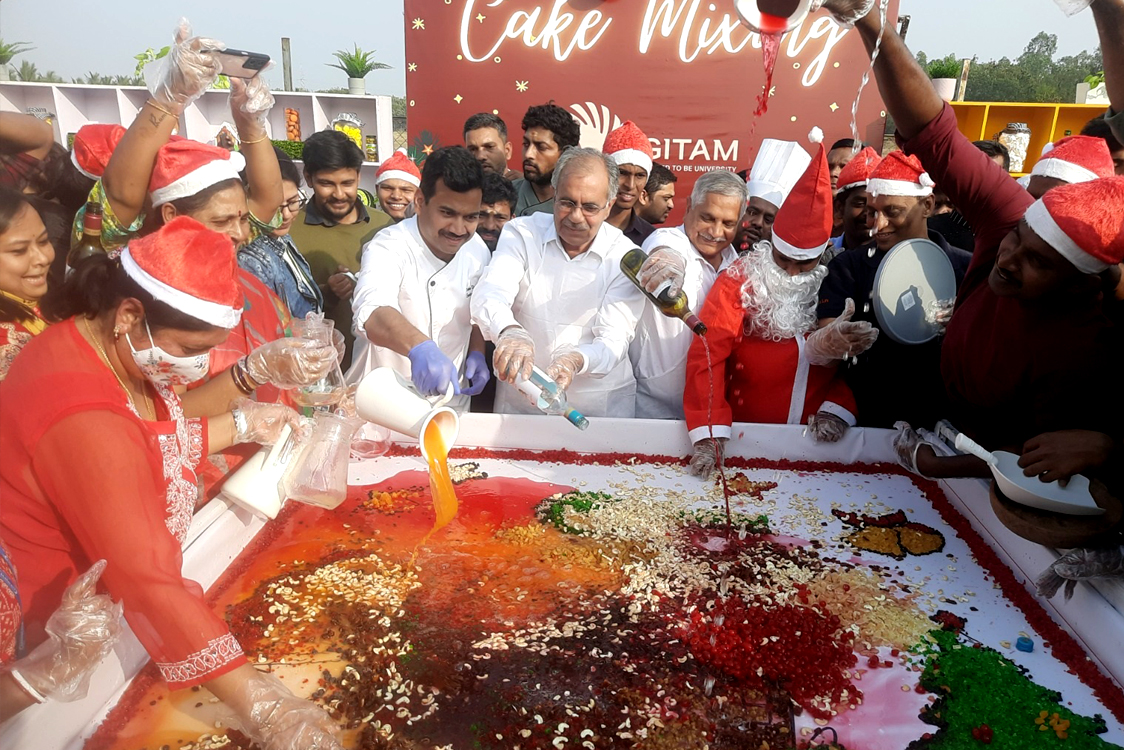 గీతం డీమ్డ్ విశ్వవిద్యాలయం, హైదరాబాద్ లోని హాస్పిటాలిటీ (ఆతిథ్య) విభాగం ఆధ్వర్యంలో శనివారం కేక్ మిక్సింగ్ వేడుకను ఉల్లాసంగా, ఉత్సాహభరితంగా, విద్యార్థుల కేరింతల మధ్య పండుగ వాతావరణంలో నిర్వహించారు. హాస్పిటాలిటీ డిప్యూటీ డైరెక్టర్ అంబికా ఫిలిప్ నేతృత్వంలో నిర్వహించిన ఈ వేడుకలో విద్యార్థులు, పలువురు సిబ్బంది, పాకశాస్త్ర నిపుణులు శాంతాక్రజ్ వేషధారణలో పాల్గొని ముందస్తు క్రిస్మస్ వేడుక వాతావరణాన్ని సృష్టించారు.కేక్ మిక్సింగ్ వేడుక అనేది క్రిస్మస్ సీజన్ ఆగమనాన్ని సూచించడమే గాక, కొత్త సంవత్సరాన్ని స్వాగతించే సమయం. ఇదో గౌరవనీయమైన సంప్రదాయం. ఇది ఆనందాన్ని ప్రతిబింబించడమే గాక, విద్యార్థుల మధ్య ఐక్యత, బృంద స్ఫూర్తిలను చాటిచెబుతుంది. అలాగే సమృద్ధిగా పంటలనిచ్చిన ప్రకృతికి కృతజ్జతలు తెలియజేస్తుంది. ఎండు పళ్లు, గింజలు, సుగంధ ద్రవ్యాలు, రసాల శ్రేణిని కలపడం, వాటిని రెండు మూడు వారాల పాటు ఊరబెట్టి గొప్ప మిశ్రమాన్ని సృష్టించడం వంటి సంతోషకరమైన ఆచారంలో విద్యార్థులు ఉత్సాహభరితంగా పాల్గొన్నారు. ఈ ప్రక్రియ ద్వారా తయారు చేసిన కేకులు తేమగా, రుచిగా, పండుగ స్ఫూర్తిని కలిగి ఉంటాయి.‘ఈ కేక్ మిక్సింగ్ కార్యక్రమం పాకశాస్త్ర కళలను ప్రోత్సహించడమే కాకుండా ఇంజనీరింగ్, మేనేజ్ మెంట్, సైన్స్, ఫార్మసీ, ఆర్కిటెక్చర్ తో సహా విభిన్న రంగాలకు చెందిన విద్యార్థుల మధ్య స్నేహాన్ని పెంపొందిస్తుంది’ అని అంబికా ఫిలిప్ అభిప్రాయపడ్డారు.ఈ కేక్ మిక్సింగ్ వేడుకలో గీతం హైదరాబాద్ అదనపు ఉపకులపతి ప్రొఫెసర్ డీ.ఎస్.రావు, రెసిడెంట్ డైరెక్టర్ డీవీవీఎస్ఆర్ వర్మ, పలువురు చెఫ్ లు, ఆతిథ్య విభాగం సిబ్బంది తదితరులు పాల్గొన్నారు. అటు గీతం ఉన్నతాధికారులు, ఇటు శాంతాక్రజ్ వేషధారణలోని విద్యార్థులు, సిబ్బంది.. సమ్మిళితంగా పండుగ వాతావరణాన్ని సృష్టించారు.కేక్ మిక్సింగ్ కేవలం పాక శాస్త్ర కళే కాదు, ఇది ఆశ, ఆనందం యొక్క వేడుక. ఈ సంప్రదాయంలో పాల్గొనడం వల్ల రాబోయే సంవత్సరంలో అదృష్టం, సంతోషం కలుగుతుందని పలువురు విశ్వసిస్తారు.