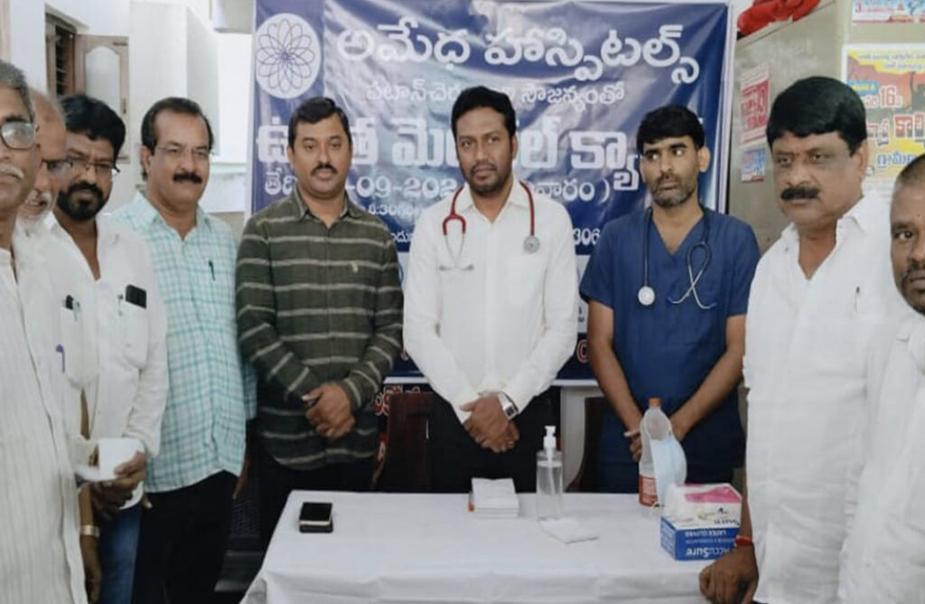 ను నిర్వహించారు. ఈ సందర్భంగా అమేధ హాస్పిటల్స్ యజమాన్యం వందమందికి పైగా పలు రకాల వైద్య సేవల తోపాటు ఉచిత మందులు, టెస్టులు నిర్వహించారు. అవసరమైన వారికి హాస్పిటల్ కి రెఫర్ చేశారు. ఈ సందర్భంగా జరిగిన సమావేశంలో పటాన్ చెరు సీఐ ప్రవీణ్ రెడ్డి మాట్లాడుతు పట్టణ ప్రాంతాలలో కొంతమేర వైద్యం అందుబాటులో ఉన్నప్పటికీ రూరల్ ఏరియాలో అవగాహన లేమితో ప్రజలు ఫ్రీ డయాబెటిక్, డయాబెటిక్ వంటి రోగాల బారిన పడుతు లక్షల రూపాయలు ఖర్చు చేసుకుంటున్నారని సామాజిక సేవా కార్యక్రమంలో భాగంగా ఇలాంటి క్యాంపులు ఏర్పాటు చేయటంతో పాటు వారిలో అవగాహన తో పాటు చైతన్య పరచలాని సూచించారు.