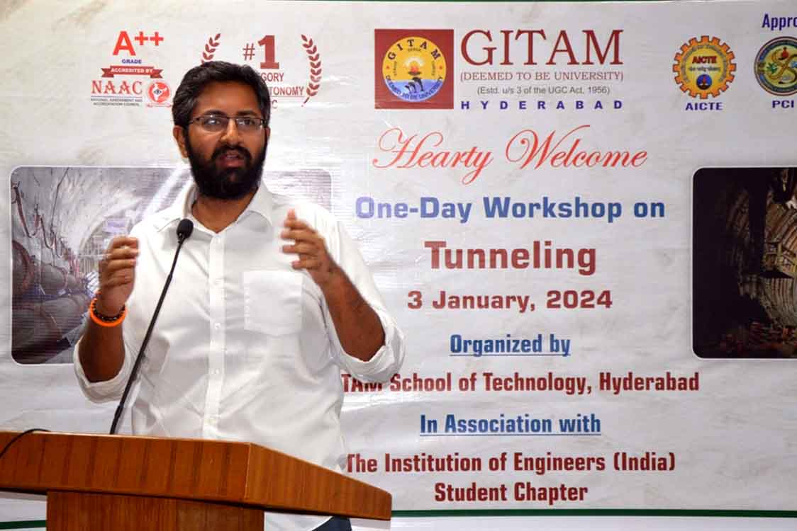 ఈ కార్యక్రమంలో ముఖ్య అతిథిగా పాల్గొన్న ఆయన, 2040 నాటికి భారతదేశం అభివృద్ధి చెందిన దేశంగా మారబోతోందని ఆశాభావం వెలిబుచ్చారు.నవంబర్ నెలలో ఉత్తరాఖండ్ లోని సిల్క్యారా టన్నెల్ ప్రమాదం, అందులో చిక్కుకున్న వారిని కాపాడడానికి చేసిన ప్రయత్నాలు, ఉపయోగించిన ఆధునాతన సాంకేతిక పరిజ్ఞానాల గురించి ఆత్మీయ అతిథిగా పాల్గొన్న స్కయ్డ్రోన్ ఇన్ఫ్రా అండ్ మెన్దింగ్ ఎండీ, ముఖ్య కార్యనిర్వహణాధికారి సిరియాక్ జోసెఫ్ వివరించారు. ఆ సనుయంలో ఎదురైన సవాళ్లు, సమష్టిగా తాము వాటిని అధిగమించిన తీరును తెలిపారు. రోజురోజుకు మారుతున్న సాంకేతికతపై పట్టు సాధించి, తనును తాము ముందజంలో ఉంచుకోవాలని విద్యార్థులకు సూచించారు.సోరంగాలు, భూగర్భ ప్రదేశాలకు సంబంధించిన జియోటెక్నికల్ సరిశోధనలపై విలువెట్టి అంతరృష్టులను హైదరాబాద్ లోని ఇంజనీరింగ్ స్టాఫ్ కాలేజ్ ఆఫ్ ఇండియా సలహాదారు ప్రొఫెసర్ డి.సి.రెడ్డి అందించారు, సిల్క్యారా టన్నెల్ చిక్కుకున్న వారిని రక్షించే కార్యక్రమంలో సిరియాక్ జోసెఫ్ పాత్రను గీతం కోర్ ఇంజనీరింగ్ డీన్ ప్రొఫెసర్ వి.రామశాస్త్రి ప్రత్యేకంగా ప్రస్తావిస్తూ, ఇతర అతిథులను కూడా పరిచయం చేశారు. సివిల్ ఇంజనీరింగ్ విభాగాధిపతి డాక్టర్ అఖిలేష్, చేపూరి స్వాగతోపన్యాసం చేయగా, మెకానికల్ ఇంజనీరింగ్ విభాగాధిపతి ప్రొఫెసర్ సి.శ్రీనివాస్ వందన సమర్పణ చేశారు.