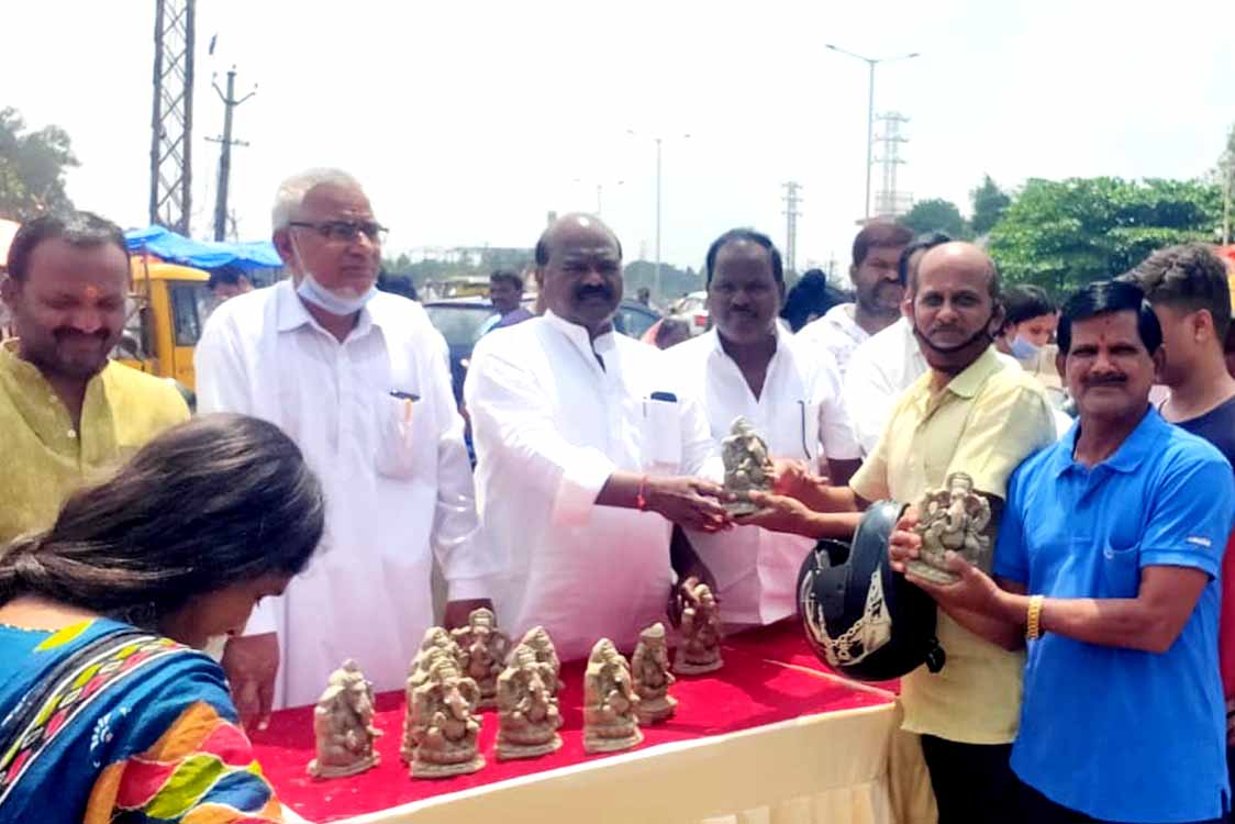 పర్యావరణ పరిరక్షణకు మట్టి విగ్రహాలు ఎంతో మేలు చేస్తాయని పటాన్ చెరు మాజీ ఎమ్మెల్యే సత్యనారాయణ అన్నారు .సంగారెడ్డి జిల్లా పటాన్ చెరు పట్టణంలోని డాక్టర్ బీఆర్ అంబేద్కర్ విగ్రహం వద్ద ప్రజలకు ఉచితంగా మట్టి వినాయక ప్రతిమలను పంపిణీ చేశారు . మారుతున్న వాతావరణ పరిస్థితుల దృష్ట్యా కాలుష్యానికి కారణమయ్యే, ప్రజలకు ఇబ్బందులు కలిగించే ప్లాస్టిక్, రసాయన వినియోగాన్ని తగ్గంచాల్సిన అవసం ఉందన్నారు . ముఖ్యంగా ప్లాస్టర్ ఆఫ్ పారిస్తో తయారు చేసే విగ్రహాల వల్ల ఏర్పడిన కాలుష్యంతో పర్యావరణానికి ముప్పు వాటిల్ల్లుతోందని … ఇలాంటి పరిస్థితుల్లో మట్టి గణపతులను పూజించడం ద్వారా భవిష్యత్ తరాలకు ఆరోగ్యకరమైన సమాజాన్ని అందించినట్లవుతుందని మాజీ ఎమ్మెల్యే సత్యనారాయణ అన్నారు .