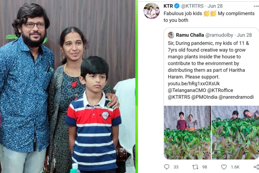 తెలంగాణ ప్రభుత్వం ప్రతిష్ఠాత్మకంగా చేపట్టిన హరిత హారం కార్యక్రమానికి ప్రభుత్వ రంగం సంస్థలు , స్వచ్చంధ సంస్థలతో పాటు ప్రజలు భాగస్వామ్యం అవుతున్నారు .పర్యావరణ పరిరక్షణ కోసం ప్రతి ఒక్కరు మొక్కలు నాటాలని తెలంగాణ ప్రభుత్వం పిలుపునివ్వడంతో మొక్కల పెంపకం జోరుగా సాగుతుంది .హైదరాబాద్ నిజాంపేట్కు చెందిన బ్యాంకు ఉద్యోగి రాంబాబు చల్లా, ప్రవీణ దంపతుల పిల్లలు ఇంటి ప్రాంగణాన్ని నర్సరీగా మార్చారు. స్థానిక శ్రీరాం స్కూల్లో దిశిత ఏడవ తరగతి , తమ్ముడు సహర్ష్ మూడోవ తరగతి చదువుతున్నారు. అక్క తమ్ముడు కలిసి వినూత్నంగా ఆలోచించి పండ్ల మొక్కలు పెంచాలనుకున్నారు . వేసవిలో పండే మామిడి పండ్లను తిని టెంకలను సేకరించి ఇంటి ప్రాంగణంలో సుమారు 200 మామిడి మొక్కలు పెంపకం చేపట్టారు . ఈ విషయాన్ని తండ్రి రాంబాబు కేటీఆర్కు ట్వీట్ చేశాడు . ఈ ట్వీట్కు స్పందించిన మంత్రి కేటీఆర్ చిన్నారుల తీసుకున్న ఈ నిర్ణయాన్ని ప్రశంసిస్తూ రీ ట్వీట్ చేశారు.పచ్చదనం పెంపొందించేందుకు మేము సైతం అంటూ ముందుకు వచ్చిన దిశిత, సహర్ష్ లను కుత్బుల్లాపూర్ ఎమ్మెల్యే వివేకానంద్ ,నిజాంపేట్ మేయర్ కొలన్ నీలా గోపాల్ రెడ్డి ,డిప్యూటీ మేయర్ ధన్ రాజ్ యాదవ్లు అభినందించారు. హరిత హారంలో భాగంగా దిశిత, సహర్ష్లు పెంచిన పండ్ల మొక్కలు వారికి పంపిణీ చేశారు.