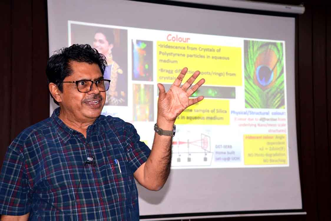 ఏ పరిశోధనకైనా ప్రకృతే మూలమని, దాని నుంచి ప్రేరణ పొంది, వాటికి ప్రయోగశాలలో ఆచరణాత్మకంగారుజువు చేయాలని భౌతిక శాస్త్ర విశిష్ట ఆచార్యుడు ప్రొఫెసర్ బీవీఆర్ టాటా సూచించారు. గీతం స్కూల్ ఆఫ్ సెన్స్ లోని భౌతిక శాస్త్ర విభాగం ఆధ్వర్యంలో ‘ఫొటోనిక్ స్పటికాల నమూనాల ఘర్షణ: భౌతికశాస్త్రం, సెన్సింగ్ అప్లికేషన్స్’ అనే అంశంపై మంగళవారం ఆయన అతిథ్య ఉపన్యాసం చేశారు. కొల్లాయిడల్ క్రిస్టల్ టెంప్లేట్లు మూడు కోణాలలో నానోమీటర్ నుంచి సబ్ మైక్రో మీటర్ లక్షణాలతో ఆవర్తనాలను నిర్మించడానికి బహుముఖ సింథటిక్ సాంకేతికగా మారుతుందన్నారు. ఈ సాంకేతికత విభిన్న పరిమాణాలు, స్వరూపాలు, కూర్పులతో పోరస్ పదార్థాల సంశ్లేషణను అనుమతించడమే గాక, వివిధ సెన్సింగ్ అప్లికేషన్లకు దారితీస్తుందని చెప్పారు. ఎలక్ట్రాన్ ల కంటే ప్రోటాన్ లను ఉపయోగించడం వల్ల కలిగే ప్రయోజనాలను వివరిస్తూ, ప్రోటాన్ లు పరమాణువులతో ఢీకొనే అవకాశం ఉందని, తత్ఫలితంగా ఎక్స్- కిరణాలు విడుదలవుతాయన్నారు. ఇది భవిష్యత్తులో మరింత ప్రత్యేకమైన పదార్థాలు, అప్లికేషన్ల అభివృద్ధికి బాటలు వేస్తుందని చెప్పారు. అధ్యాపకులు, విద్యార్థుల ప్రశ్నలకు జవాబులివ్వడంతో ఈ కార్యక్రమం ముగిసింది.భౌతిక శాస్త్ర విభాగాధిపతి ప్రొఫెసర్ టి. విశ్వం అతిథికి జ్ఞాపికను అందజేసి. కృతజ్ఞతలు తెలియజేశారు. ఈ ఉపన్యాసం భౌతికశాస్త్రంలో అత్యాధునిక పరిజ్ఞానం, దాని అనువర్తనాలపై లోతైన అవగాహనను ఏర్పరచింది.