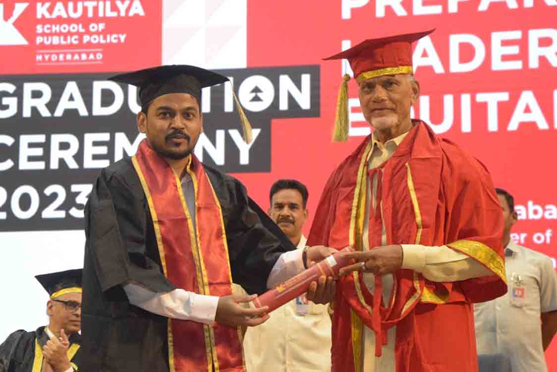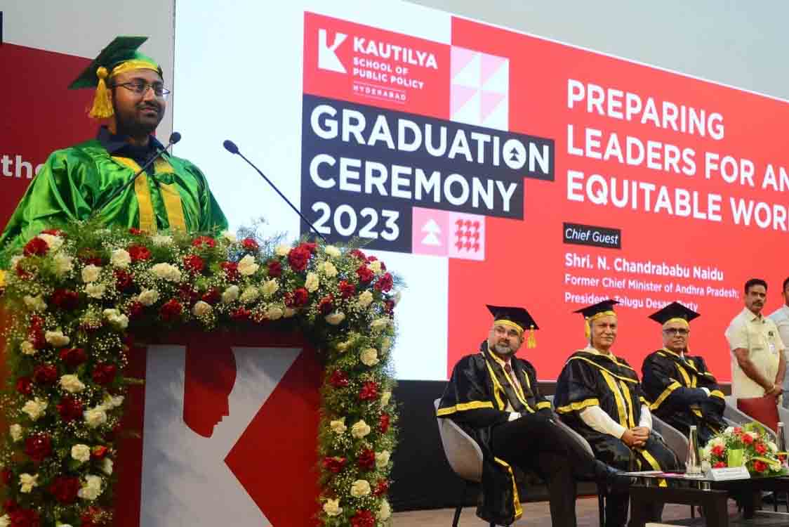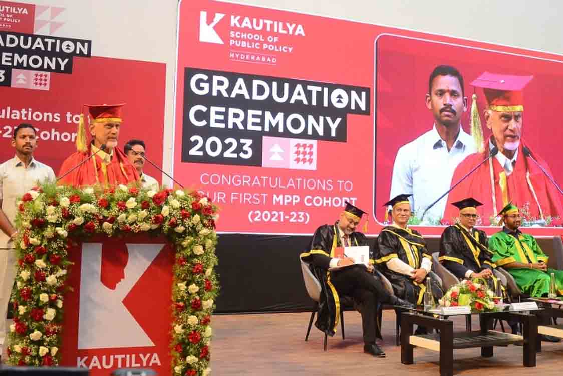 కౌటిల్యా స్కూల్ ఆఫ్ పబ్లిక్ పాలసీ తన తొలి పట్టాల ప్రదానోత్సవ వేడుకను ఆదివారం గీతం హెదరాబాద్ ప్రాంగణంలోని శివాజీ ఆడిటోరియంలో ఘనంగా జరుపుకుంది. సంప్రదాయ అకడమిక్ ప్రొసెషన్తో ప్రారంభమైన ఈ వేడుకలు జాతీయ గీతాలాపన, జ్యోతి ప్రజ్వలనతో శ్రీకారం చుట్టుకుంది.ఈ కార్యక్రమానికి ముఖ్య అతిథిగా హాజరైన ఆంధ్రప్రదేశ్ పూర్వ ముఖ్యమంత్రి, తెలుగుదేశం పార్టీ జాతీయ అధ్యక్షుడు శ్రీ నారా చంద్రబాబు నాయుడు మాట్లాడుతూ, తన మాటతో ఎవరు అంగీకరించి, లేకపోయినా, 2047 నాటికి భారతదేశం ,ఆర్థికంగా ప్రపంచంలోనే తొలి లేదా ద్వితీయ స్థానానికి చేరుకుంటుందని, భారతీయులు ప్రపంచమంతటా గొప్పవారు కాబోతున్నారని జోస్యం చెప్పారు. ఏదైనా సాధించాలనుకుంటే, దానిని దృశ్యమానం (నిజువలెజ్డ్) చేసుకుని, ఒక ప్రణాళికాబద్ధంగా ముందుకు సాగుతూ, దానిని స్పష్టంగా అమలు చేయాలని ఆయన సూచించారు. తన దృష్టిలో 2047 కార్పొరేట్ గవర్నెన్స్, భారతీయులు ఆధిపత్యం చెలాయిస్తారని, పబ్లిక్ గవర్నెన్స్లో కూడా వారు ఆధిపత్యం వహించాలని ఆయన ఆకాంక్షించారు. మనను 75 ఏళ్లు పాలించిన బ్రిటన్ ప్రధానిని చూస్తే భారతీయుల బలం తేటతెల్లమవుతుందని హర్షధ్వానాల మధ్య ప్రకటించారు. ప్రస్తుతం అమెరికా, ఐరోపాలలో మధ్యతరగతి ఆదాయం ఎక్కువగా ఉన్నవారు ఉన్నారని, భవిష్యత్తులో అది భారత్ వైపు మళ్లుతుందన్నారు.