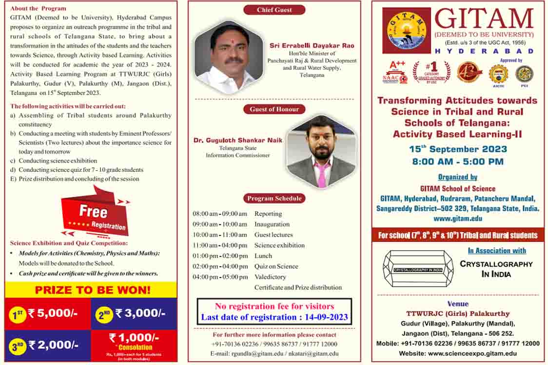 తెలంగాణ ప్రాంతంలోని గిరిజన/గ్రామీణ పాఠశాల విద్యార్థులలో శాస్త్ర విజ్ఞానం (సెన్ట్స్)పై అవగాహన ఏర్పరచి, కార్యాచరణ ఆధారిత అభ్యాసం ద్వారా శాస్త్రం పట్ల వారి వెఖరిని మార్చే లక్ష్యంతో వెజ్ఞానిక ప్రదర్శన, క్విజ్ పోటీలను హెదరాబాద్ లోని గీతం డీమ్డ్ విశ్వవిద్యాలయం నిర్వహించనున్నది. క్రిస్టలోగ్రఫీ సొసెట్టీ ఆఫ్ ఇండియా సౌజన్యంతో, విద్యార్థులకు చేరువయ్యే లక్ష్యంతో చేపట్టిన ఈ కార్యక్రమాన్ని జనగామ జిల్లా, పాలకుర్తి మండలంలోని గూడూరు గ్రామంలో ఈనెల 15వ తేదీన ఉదయం 8 నుంచి సాయంత్రం 5 గంటల వరకు నిర్వహించనున్నట్టు మంగళవారం విడుదల చేసిన ప్రకటనలో కార్యక్రమ నిర్వాహకులు డాక్టర్ ఎం.ఎస్. సురేంద్రబాబు, డాక్టర్ టీ.బీ.పాత్రుడు తెలియజేశారు.