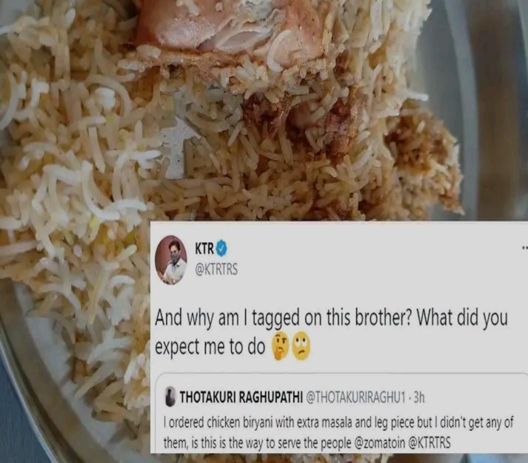 సోషల్ మీడియాలో తెలంగాణ మంత్రి కేటీఆర్ ఎంత యాక్టివ్ గా ఉంటారో ప్రత్యేకంగా చెప్పనక్కర్లేదు. సాయం కోరుతూ తనను ట్యాగ్ చేసిన ప్రతి ఒక్కరికీ వ్యక్తిగతంగా బదులిచ్చేందుకు ప్రయత్నిస్తుంటారు. ఏదైనా కష్టం వచ్చి కేటీఆర్ ను సంప్రదిస్తే ఫర్వాలేదు కానీ, బిర్యానీలో మసాలా తక్కువైందంటూ ఓ నెటిజన్ తనను ట్యాగ్ చేయడంతో ఆయన విస్మయానికి గురయ్యారు.