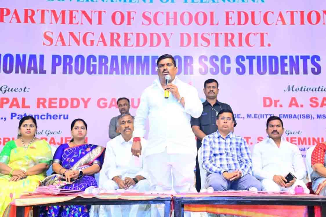 అనంతరం ఏర్పాటు చేసిన సమావేశంలో ఆయన మాట్లాడుతూ ముఖ్యమంత్రి కేసీఆర్ ప్రభుత్వ విద్యారంగానికి వేలకోట్ల రూపాయలు కేటాయిస్తున్నారని తెలిపారు. మన ఊరు మనబడి ద్వారా విద్యారంగంలో విప్లవాత్మక సంస్కరణలకు శ్రీకారం చుట్టారని అన్నారు. దీని మూలంగా ప్రభుత్వ పాఠశాలలో అడ్మిషన్లు దొరికని పరిస్థితి ఏర్పడిందన్నారు.పటాన్చెరు నియోజకవర్గ పరిధిలోని పదవ తరగతి విద్యార్థులందరికీ సొంత ఖర్చుతో అత్యంత విలువైన సమాచారంతో కూడిన స్టడీ మెటీరియల్, పరీక్ష సామాగ్రి పంపిణీ చేయడం జరిగిందని అన్నారు. పరీక్షలు పూర్తయ్యే వరకు విద్యార్థులందరూ మొబైల్స్ ను దూరంగా ఉంచాలని, తల్లితండ్రులు సైతం ఎటువంటి పనులు చెప్పకుండా, పూర్తి సహకారం అందించాలని కోరారు. పదవ తరగతి ఫలితాల పైనే భవిష్యత్తు ఆధారపడి ఉంటుందన్న విషయాన్ని గమనించాలని కోరారు. అనంతరం డాక్టర్ సతీష్ మాట్లాడుతూ ఒత్తిడికి గురికాకుండా ఇష్టపడి చదవాలని సూచించడంతోపాటు ఒత్తిడిని అధిగమించే మెలకువలను తెలియజేశారు.ఈ కార్యక్రమంలో నియోజకవర్గ ప్రజాప్రతినిధులు, వివిధ శాఖల అధికారులు, విద్యార్థినీ విద్యార్థులు పాల్గొన్నారు.