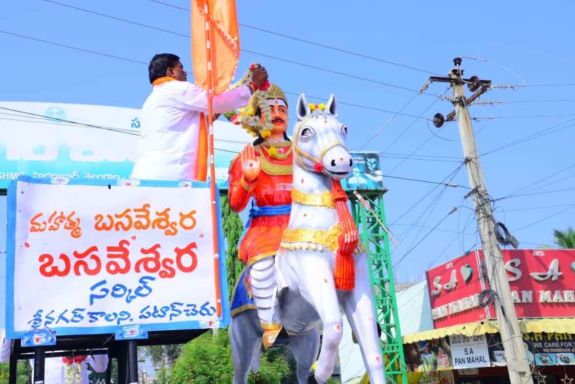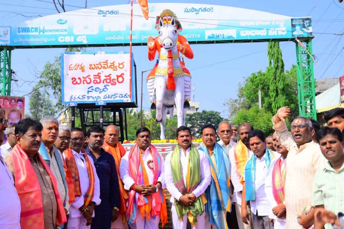 సమాజంలో అంటరానితనం, వివక్షతకు వ్యతిరేకంగా పోరాడిన మహోన్నత వ్యక్తి మహాత్మా బసవేశ్వరుడని, ఆయన సూచించిన విధానం నేటి తరానికి స్ఫూర్తిదాయకమని పటాన్చెరు శాసనసభ్యులు గూడెం మహిపాల్ రెడ్డి అన్నారు.మహాత్మ బసవేశ్వరుడి 890వ జయంతిని పురస్కరించుకొని.. పటాన్చెరు డివిజన్ పరిధిలోని శాంతినగర్ కాలనీ జాతీయ రహదారి పక్కనగల అశ్వారుడ బసవేశ్వరుడి విగ్రహానికి పూలమాలవేసి ఘన నివాళులు అర్పించారు.అనంతరం ఏర్పాటు చేసిన సమావేశంలో ఆయన మాట్లాడుతూ.. 12వ శతాబ్దంలోనే కులం మతం వర్ణ వివక్షత లేని సమాజం కోసం అనుభవ మంటపాన్ని ఏర్పాటు చేసి, అన్ని మతాలు ఒక్కటేనని, మనుషులందరూ సమానమేనని చాటిచెప్పిన గొప్ప అభ్యుదయ వాది బసవేశ్వరుడని కొనియాడారు. భవిష్యత్ తరాలకు ఆయన స్ఫూర్తిని అందించాలన్న లక్ష్యంతో.. ముఖ్యమంత్రి కేసీఆర్ రాష్ట్ర రాజధాని హైదరాబాదులోని ట్యాంకు బండ్ పైన బసవేశ్వరుడి విగ్రహాన్ని ఏర్పాటు చేశారని, అదే స్ఫూర్తితో బీరంగూడలో 12 అడుగుల అశ్వరుడా బసవేశ్వరుడి విగ్రహాన్ని వారం రోజుల క్రితం ఏర్పాటు చేయడం జరిగిందని తెలిపారు. కాయమే (శరీరం) కైలాసమని చాటి శ్రమ జీవులకు అత్యంత గౌరవం తీసుకువచ్చారని అన్నారు.