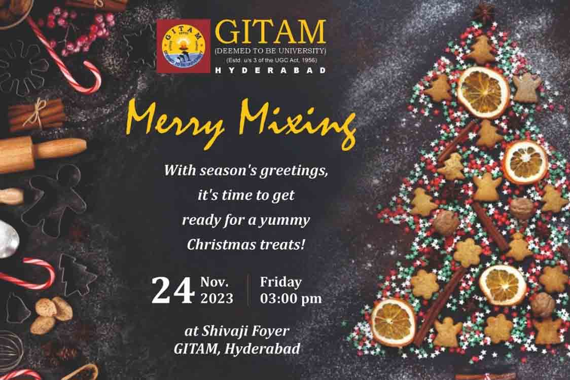 గీతం డీమ్డ్ విశ్వవిద్యాలయం, హెదరాబాద్ లో ‘మెర్రీ మిక్సింగ్’ పేరిట వినోధభరితమైన కేక్ మేకింగ్ కార్యక్రమాన్ని ఈనెల 24వ తేదీన నిర్వహించనున్నట్టు శుక్రవారం విడుదల చేసిన ఒక ప్రకటనలో వెల్లడించారు. క్రిస్మస్ ఆనందాన్ని పంచేందుకు వివిధ విభాగాలకు చెందిన విద్యార్థులను ఆహ్వానిస్తూ ఆతిథ్య (హాస్పిటాలిటీ) విభాగం ఈ వేడుకను నిర్వహిస్తోంది.క్రిస్మస్ సీజన్ సమీపిస్తున్నందున, ఈ సందర్భాన్ని పురస్కరించుకుని రుచికరమైన స్నాక్స్, ట్రీట్లతో జరుపుకోవడాన్ని గీతం ప్రోత్సహిస్తోంది. వర్ధమాన ఇంజనీర్లు, మేనేజర్లు, శాస్త్రవేత్తలు, ఫార్మసిస్టులు, ఆర్కిటెక్ట్లు, ఇతర విభాగాల విద్యార్థులను ఒకచోట చేర్చడం లక్ష్యంగా ఈ కేక్ మిక్సింగ్ వేడుకలను నిర్వహిస్తున్నారు.’మెర్రీ మిక్సింగ్’ వేడుకను నిర్వహించడాన్ని, పండుగ సీజన్ను ఉత్సాహభరితం చేయడానికి సంతోషిస్తున్నట్టు ఆతిథ్య విభాగం డిప్యూటీ డెరైక్టర్ అంబికా ఫిలిప్ తెలిపారు. ఈ వేడుక తమ ప్రాంగణంలో ఆనందం, ఉత్సాహాన్ని నింపడమే గాక తమ విద్యార్థుల మధ్య ఐక్యత, వేడుకల భావాన్ని పెంపొందిస్తుందని తాము విశ్వసిస్తున్నామన్నారు.మెర్రీ మిక్సింగ్’ వేడుక కోసం విద్యార్థులు, అధ్యాపకులు, సిబ్బంది ఉత్సాహంగా చూడడమే కాక, ఇందులో పాల్గొనమని తమ తోటివారిని కూడా ప్రోత్సహిస్తున్నట్టు అంబిక తెలియజేశారు.