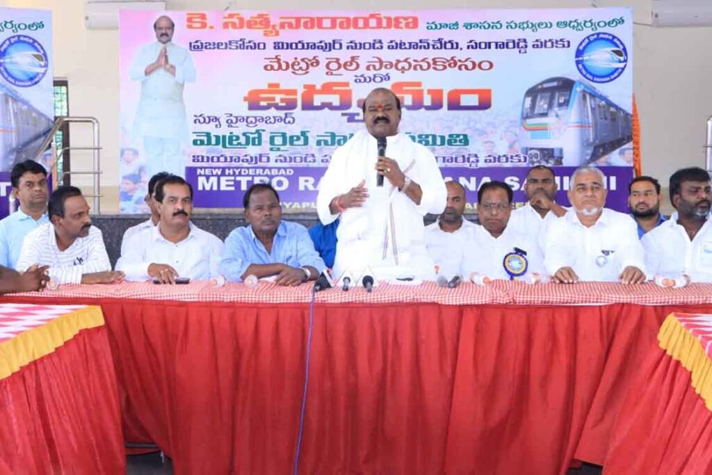 హైద‌రాబాద్ మెట్రోరైలును సంగారెడ్డి వ‌ర‌కు పొడ‌గించాలని మెట్రోరైలు సాధ‌న స‌మితి వ్య‌వ‌స్థాప‌క అధ్య‌క్షులు ,మాజీ ఎమ్మెల్యే స‌త్య‌నారాయ‌ణ డిమాండ్ చేశారు. సంగారెడ్డి జిల్లా ప‌టాన్ చెరులోని ముదిరాజ్ భ‌వ‌న్ లో మెట్రో రైలు సాధ‌న స‌మితి ఆధ్వ‌ర్యంలో చ‌ర్చావేదిక నిర్వ‌హించారు. ఈ చర్చా వేదిక కార్యక్రమంలో రాజకీయాల‌కు అతీతంగా పెద్ద ఎత్తున వివిధ పార్టీల నాయకులు, ప్రజలు ,కార్మికులు ,కర్షకులు, ఉద్యోగులు, విద్యావేత్తలు ,ప్రొఫెసర్లు ,పారిశ్రామికవేత్తలు, యువకులు పెద్ద ఎత్తున పాల్గొని విజయవంతం చేశారు .మెట్రో రైలును మియాపూర్ నుండి ప‌టాన్ చెరు మీదుగా సంగారెడ్డి వ‌ర‌కు విస్తరించాల్సిన అవ‌శ్య‌క‌త ఎంతైనా ఉంద‌ని మాజీ ఎమ్మెల్యే సత్య‌నారాయ‌ణ అన్నారు. కేంద్ర ,రాష్ట్ర ప్ర‌భుత్వాలు బీహెచ్ఈఎల్ ప్రాంతంలో మెట్రోరైల్ , ఫ్లై ఓవ‌ర్ నిర్మించాల‌నే ప్ర‌తిపాద‌న ఉంద‌న్నారు.ప‌టాన్ చెరు ప్రాంతంలో ట్రాఫిక్ దృష్ట్యా మెట్రో క‌మ్ ఫ్లై ఓవ‌ర్ ను ప‌టాన్ చెరువు వ‌ర‌కు నిర్మించేందుకు కృషి చేయాల‌ని కోరారు. ఇదే విష‌యంపై కేంద్ర మంత్రి నితిన్ గ‌డ్కారీ లేఖ రాస్తామ‌ని పేర్కొన్నారు.