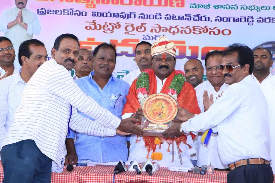 మెట్రోరైలు సాధ‌న ఉద్యమంలో ప్రతి ఒక్కరూ భాగస్వాములు కావాలని స‌త్య‌నారాయ‌ణ పిలుపునిచ్చారు.ఈ ఉద్యమాన్ని ప్రజలకు చేరువ చేసేలా విధి విధానాలు రూపొందించి అతి త్వరలో కార్యాచరణ ప్రకటిస్తామ‌న్నారు .ప్రజల్లోకి వెళ్లి ఉద్యమాన్ని మ‌రింత ఉధృతం చేయనున్నట్లు ఆయన పేర్కొన్నారు. పారిశ్రామిక ప్రాంతంలో జనభా రద్దీని దృష్టిలో పెట్టుకొని ప్రభుత్వం మెట్రో రైలు వసతిని కల్పించాలని డిమాండ్ చేశారు. ప్రభుత్వం దిగివచ్చి మెట్రో రైలు  పొడిగించేంత వరకు తమ పోరాటాలను ఉదృతం చేస్తామని ఆయన  తెలిపారు. చ‌ర్చ వేదిక నిర్వ‌హించిన మెట్రో రైలు సాధ‌న స‌మితి వ్య‌వ‌స్థాప‌క అధ్య‌క్షులు , మాజీ ఎమ్మెల్యే స‌త్య‌నారాయ‌ణ‌ను స్థానికులు ఘ‌నంగా స‌న్మానించారు .