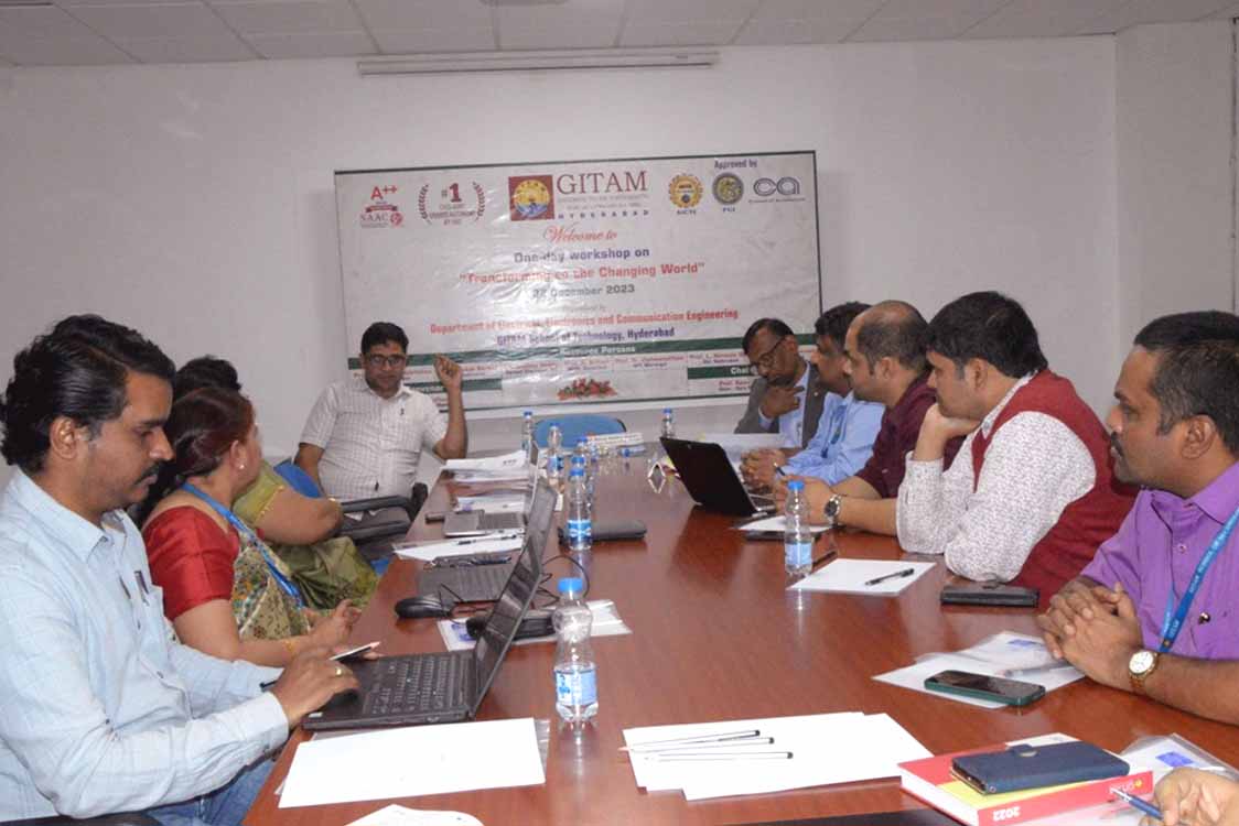 గీతం డీమ్డ్ విశ్వవిద్యాలయం, స్కూల్ ఆఫ్ టెక్నాలజీలోని ఎలక్ట్రికల్, ఎలక్ట్రానిక్స్ అండ్ కమ్యూనికేషన్ ఇంజనీరింగ్ విభాగం ‘మారుతున్న ప్రపంచానికి రూపాంతరం’ పేరిట పాఠ్యంశాల మార్పుపే ఒకరోజు కార్యశాల నిర్వహించింది. అభివృద్ధి చెందిన వాతావరణానికి అనుగుణంగా సిలబస్ లో మార్పులుచేర్పులు చేపట్టే లక్ష్యంతో దీనిని ఏర్పాటు చేశారు. గీతం కోర్ ఇంజనీరింగ్ డీన్ ప్రొఫెసర్ వి.రామశాస్త్రి, ఈఈసీఈ విభాగాధిపతి ప్రొఫెసర్ టి.మాధవిల ఆధ్వర్యంలో జరిగిన ఈ వర్క్ షాప్ లో ప్రఖ్యాత విద్యా సంస్థల నిపుణులు పాల్గొన్నారు. ఐఐటీ హైదరాబాద్ కు చెందిన ప్రొఫెసర్ వి.శివరామకృష్ణ, ప్రొఫెసర్ వాస్కర్ సర్కార్, ఐఈఈ మాజీ చైర్మన్ డాక్టర్ బ్రహ్మారెడ్డి, ఎన్సిటీ సూరత్కల్ కు చెందిన ప్రొఫెసర్ సి.శ్రీహరి, వరంగల్ లోని ఎన్ఐఐటీకి చెందిన ప్రొఫెసర్ ఎన్.విశ్వనాథం, ఉస్మానియా విశ్వవిద్యాలయానికి చెందిన ప్రొఫెసర్ ఎ. నిర్మలాదేవి, ప్రొఫెసర్ జి. యేసురత్నం రిసోర్స్ పర్సన్లుగా పాల్గొని తమ విలువైన సలహాలు, సూచనలను చేశారు. సరిశ్రమలో మారుతున్న డిమాండ్ కు అనుగుణంగా పాఠ్యాంశాలను మార్పును వారు సూచించారు.గీతం ఈఈసీఈ విభాగానికి చెందిన అధ్యాపకులు కూడా పాల్గొని, వారి విలువైన సూచనలతో కొత్త సిలబస్ రూపకల్పనకు సాయపడ్డారు. విద్యాపరమైన పురోగతిలో ముందంజలో ఉండడానికి, సమాజ అవసరాలకు అనుగుణంగా పాఠ్యాంశాలను తీర్చిద్దిడంలో గీతం నిబద్ధతను ఈ కార్యశాల ప్రతిబింబించింది.