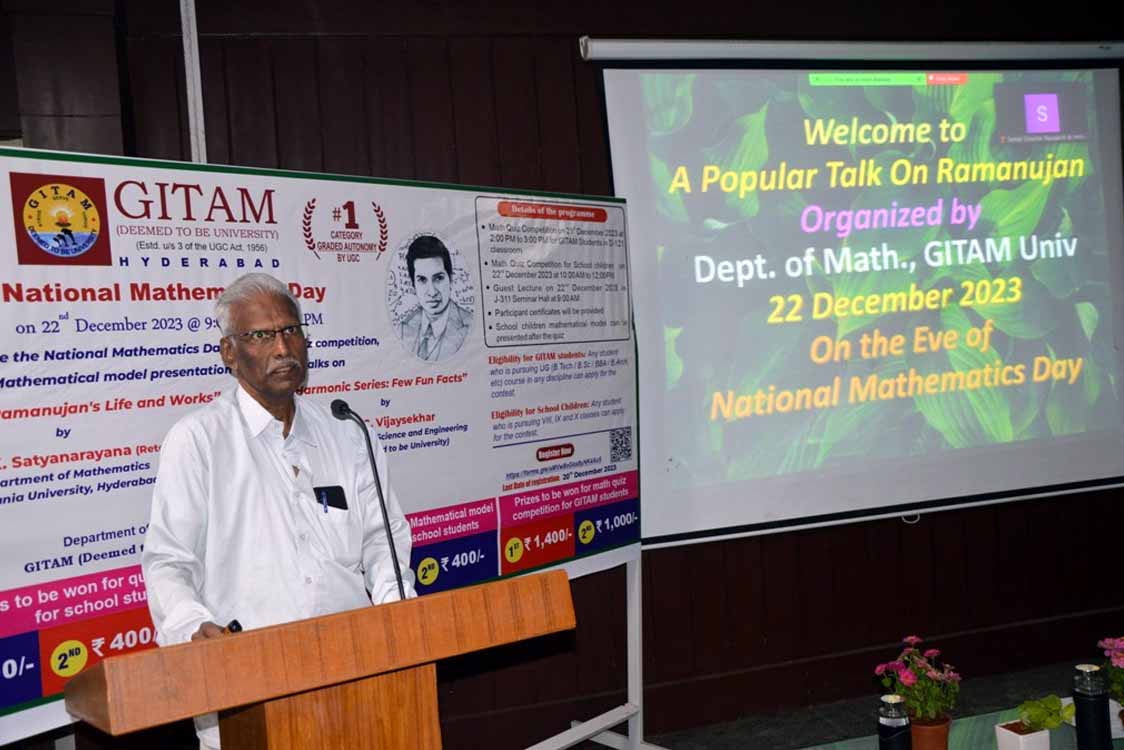 గీతం స్కూల్ ఆఫ్ సైన్స్ లోని గణిత శాస్త్ర విభాగం ఆధ్వర్యంలో ‘జాతీయ గణిత దినోత్సవాన్ని’ శుక్రవారం ఘనంగా నిర్వహించారు. ఈ సందర్భంగా పాఠశాల విద్యార్థుల కోసం క్విజ్, గణిత నమూనా ప్రదర్శన, గణిత క్విజ్ పోటీలను నిర్వహించి, విజేతలకు బహుమతులను, ప్రశంసాపత్రాలను పంపిణీ చేశారు. ఈ కార్యక్రమంలో ఉస్మానియా విశ్వవిద్యాలయం గణిత శాస్త్ర విభాగం పూర్వ ప్రొఫెసర్ కె.సత్యనారాయణ ముఖ్య అతిథిగా పాల్గొన్నారు. భారతీయ గణిత శాస్త్రవేత్త 136వ జయంతిని పురస్కరించుకుని శ్రీనివాస రామానుజన్ జీవితం, ఆయన సేవలను ఈ సందర్భంగా స్మరించుకున్నారు. పేద కుటుంబంలో పుట్టినా తనకు ఇష్టమెనై లెక్కల్లో పట్టుసాధించి, ఆంగ్లేయుల ప్రశంసలు పొందడం వరకు ఆయన వివరించారు. పది, పన్నెండో తరగతులలో అనుత్తీర్ణుడైనా,లెక్కలపై ఉన్న మక్కువ ద్వారా బీఏ పట్టానే కాకుండా రాయల్ అకాడమీ ఫెలోషిప్ సాధించినట్టు చెప్పారు. ప్రొబబిలిస్టిక్ నంబర్ థియరీ, కొన్ని అంకగణిత విధులసి ఆయన రాసిన సంచలనాత్మక పత్రాలు, రామానుజన్ విజయాలను వివరించారు.లెక్కల్లో కొన్ని సరదా వాస్తవాల గురించి గీతం సీఎస్ఈ డీన్ ప్రొఫెసర్ సి.విజయశేఖర్, గణిత శాస్త్ర రంగానికి రామానుజన్ సేవల గురించి గీతం సైన్స్ డీన్ ప్రొఫెసర్ కొల్లూరు శ్రీకృష్ణ, స్మరించుకున్నారు. కార్యక్రమ సమన్వయకర్త డాక్టర్ కృష్ణ, వందన సమర్పణతో ముగిసిన ఈ కార్యక్రమంలో గణితశాస్త్ర విభాగాధిపతి ప్రొఫెసర్ మోతహర్ రెజా, సీనియర్ ప్రొఫెసర్ బీ.ఎం. నాయుడు, డాక్టర్ డి. మల్లికార్జునరెడ్డి, ఇతర ఆధ్యాపకులు, విద్యార్థులు పాల్గొన్నారు.