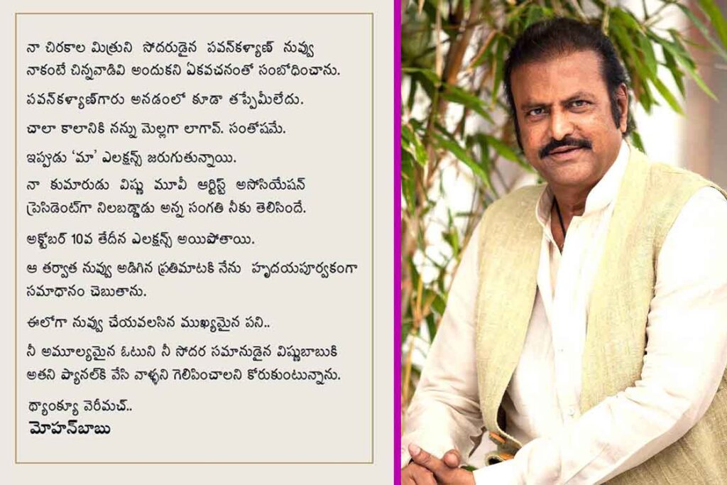 అయితే పవన్ కల్యాణ్ గారు అనడంలో కూడా తప్పేమీ లేదని పేర్కొన్నారు. చాలా కాలానికి తనను ఈ వ్యవహారంలోకి లాగావు… సంతోషం అంటూ పవన్ ను ఉద్దేశించి మోహన్ బాబు వ్యాఖ్యానించారు. అయితే ప్రస్తుతం ‘మా’ ఎన్నికల కోలాహలం నెలకొని ఉంది, అక్టోబరు 10న ‘మా’ ఎన్నికలు ముగిసిన తర్వాత నువ్వు అడిగిన ప్రతి మాటకు హృదయపూర్వకంగా సమాధానం చెబుతానని మోహన్ బాబు స్పష్టం చేశారు.‘మా’ ఎన్నికల్లో తన కుమారుడు మంచు విష్ణు పోటీ చేస్తున్నాడని, పవన్ కల్యాణ్ తన కుమారుడుమంచు విష్ణు ప్యానెల్ కు ఓటేయాలని మోహన్ బాబు ఈ సందర్భంగా సూచించారు.