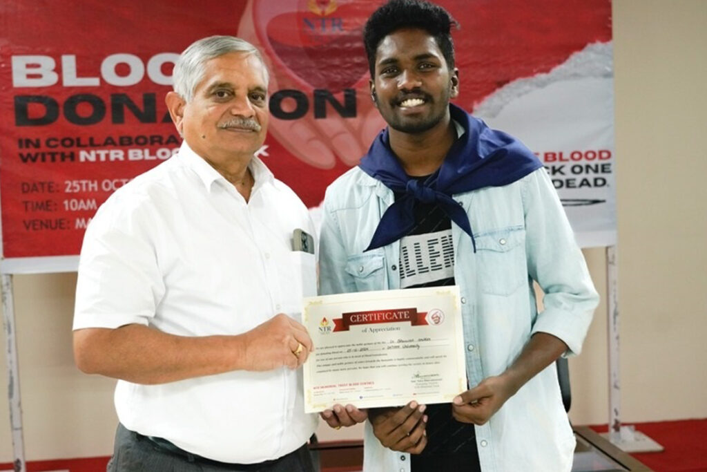 రక్తదానం ప్రాణదానంతో సమానమని, ప్రతి విద్యార్థి చేసే రక్తదానం ఆపదలో ఉన్న మరో వ్యక్తి లేదా వ్యక్తులకు ఉపయోగపడుతుందని గీతం హైదరాబాదు అదనపు ఉపకులపతి ప్రొఫెసర్ డీ.ఎస్. రావు అన్నారు. గీతం డీమ్డ్ విశ్వవిద్యాలయం, హైదరాబాదులోని జాతీయ సేవా పథకం (ఎన్ఎస్ఎస్), చరైవేతి విద్యార్థి విభాగాలు శుక్రవారం సంయుక్తంగా రక్తదాన శిబిరాన్ని ఏర్పాటు చేశారు. ఎన్టీఆర్ ట్రస్టు సౌజన్యంతో, ‘రక్తదానం చేయండి, జీవితాన్ని దానం చేయండి’ ఇతివృత్తంతో నిర్వహించిన ఈ కార్యక్రమం, రక్తదానం ద్వారా ప్రాణాలను రక్షించే ప్రభావం గురించి అవగాహన పెంచడం లక్ష్యంగా పెట్టుకుంది. ఈ శిబిరానికి విద్యార్థులు, అధ్యాపకులు, సిబ్బంది నుంచి విశేషమైన స్పందన కనిపించింది. ఈ శిబిరాన్ని నిర్వహించడంలో విద్యార్థుల అంకితభావాన్ని ప్రోవీసీ ప్రొఫెసర్ డీ.ఎస్. రావు ప్రశంసించారు. ఇలాంటి మానవతా ప్రయత్నాలలో నిరంతరం పాల్గొనాలని ఆయన ప్రోత్సహించారు. రక్తదానం విలువను నొక్కి చెబుతూ, ఇందులో స్వచ్ఛందంగా పాల్గొన్న వారందరికీ ఆయన అభినందనలు తెలియజేశారు.