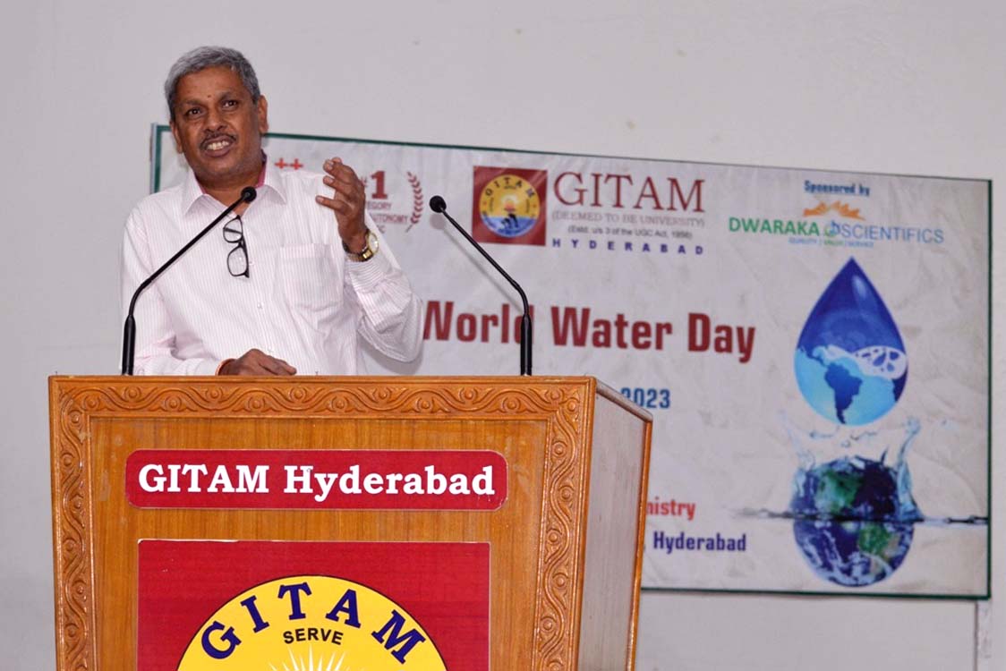 తెలంగాణలోని చాలా నీటివనరులు కనీసం స్నానం చేయడానికి కూడా పనిరాని విధంగా తయారయ్యాయని ఆయన విచారం నెలిబుచ్చారు. నీరు, పారిశుధ్య సంక్షోభాన్ని పరిష్కరించడానికి, మార్పును వేగవంతం చేయడానికి ప్రపంచ నీటి దినోత్సవాన్ని నిర్వహిస్తున్నారని, ఎందుకంటే నీరు ప్రతి ఒక్కరినీ ప్రభావితం చేస్తుందని, నూర్పు ప్రతి ఒక్కరిలో వచ్చి నివారణ చర్యలు చేపట్టాలని ఆయన సూచించారు. అరబిందో పరిశ్రమలో ఆచరిస్తున్న వ్యర్థాల నివారణ చర్యలను పవర్ పాయింట్ ప్రజెంటేషన్ ద్వారా వివరించారు. విద్యార్థులు అడిగిన పలు ప్రశ్నలకు జవాబులిచ్చారు.తొలుత, స్కూల్ ఆఫ్ సెర్చ్ ప్రిన్సిపాల్ ప్రొఫెసర్ దత్తాత్రి కె.నగేష్ ప్రారంభోపన్యాసం చేసి, అతిథిని సర్కరించగా, కార్యక్రను నిర్వాహకురాలు డాక్టర్ ఆర్.సిసూదేవి నందన సమర్పణ చేశారు. ఈ సందర్భంగా విద్యార్థులు, అధ్యాపకులంగా నీటి సంరక్షణ ప్రతిజ్ఞ చేశారు. గోడపత్రికల రూపకల్పన, ముఖ చిత్ర లేఖనం వంటి పలు పోటీలు నిర్వహించి, విజేతలకు బహుమతులు, ప్రశంసా పత్రాలను అందజేశారు.