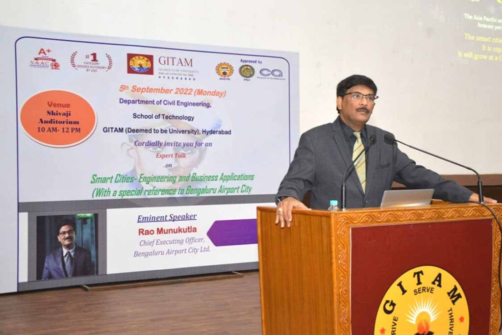 ప్రపంచ భవిష్యత్తును , నగరాల భవిష్యత్తును వేరుచేయడం కష్టమని , ప్రపంచ జనాభాలో సగానికి పైగా నగరాలు 80 శాతం స్థూల జాతీయోత్పత్తిని ( జీడీపీ ) అందిస్తున్నాయని బెంగళూరు ఎయిర్పోర్ట్ సిటీ లిమిటెడ్ ముఖ్య కార్యనిర్వహణాధికారి ( సీఈవో ) రావు మునుకుట్ల చెప్పారు . హైదరాబాద్ లోని గీతం డీమ్డ్ విశ్వవిద్యాలయంలో సోమవారం ఆయన ‘ స్మార్ట్ సిటీస్ – ఇంజనీరింగ్ అండ్ బిజినెస్ అప్లికేషన్స్ ‘ ( బెంగళూరు ఎయిర్పోర్ట్ సిటీ – ఓ అధ్యయనం ) అనే అంశంపై ఆయన ప్రసంగించారు . ‘ ఉపాధ్యాయుల దినోత్సవాన్ని పురస్కరించుకుని , గీతం స్కూల్ ఆఫ్ టెక్నాలజీలోని సివిల్ ఇంజనీరింగ్ విభాగం అధ్వర్యంలో నిర్వహించిన ఈ కార్యక్రమంలో ఆయన మాట్లాడుతూ , స్మార్ట్ సిటీల రంగంలో తనకున్న విశేష అనుభవం , నెపుణ్యాలను విద్యార్థులతో పంచుకున్నారు . ప్రపంచ జనాభాలో దాదాపు 70 శాతం మంది 2050 నాటికి పట్టణాలలోనే నివసిస్తారని , 90 శాతం ఆర్థిక కార్యకలాపాలు అక్కడే జరుగుతాయని జోస్యం చెప్పారు . ఐక్యరాజ్య సమితి అంచనాల ప్రకారం 2030 నాటికి మెగాసిటీలలో నివసించే వారి సంఖ్య 35 శాతం పెరుగుతుందని , అభివృద్ధి చెందుతున్న ఆర్థిక వ్యవస్థలలోనే ఇది ఎక్కువగా జరుగుతుందన్నారు .