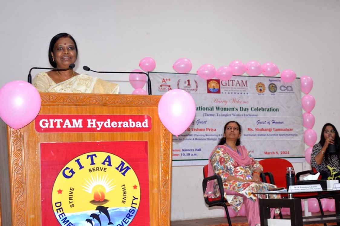 సమాజహితం కోరి చేసే ఏ పనినైన , మరొకరి సాయం కోసం ఎదురు చూడకుండా, ఆత్మవిశ్వాసంతో ముందడుగు వేసి విజయం సాధించాలని సీసీఎంబీ సీనియర్ శాస్త్రవేత్త డాక్టర్ ఎం. ఆర్. విష్ణుప్రియ సూచించారు. గీతం డీమ్డ్ విశ్వవిద్యాలయం, హైదరాబాద్ లోని మహిళా విభాగం ఆధ్వర్యంలో ‘ప్రపంచ మహిళా దినోత్సవాన్ని’ శుక్రవారం ఘనంగా నిర్వహించారు. ఉమెన్ లీడర్స్ ఫోరమ్, ఈ-క్లబ్, జీ-స్టూడియో, స్టూడెంట్ లైఫ్ సంయుక్త సౌజన్యంతో నిర్వహించిన కార్యక్రమంలో డాక్టర్ విష్ణుప్రియ ముఖ్య అతిథిగా పాల్గొన్నారు. ఈ సందర్భంగా తనకు ఎదురైన అనుభవాలను ఆమె విద్యార్థులతో పంచుకున్నారు. వరికి 1998లో వచ్చిన తెగులును అధిగమించి, అధిక దిగుబడి, పోషక విలువలతో కూడిన వంగడాన్ని రూపొందించడంలో ఎదురైన కష్టనష్టాలను డాక్టర్ విష్ణుప్రియ వివరించారు.