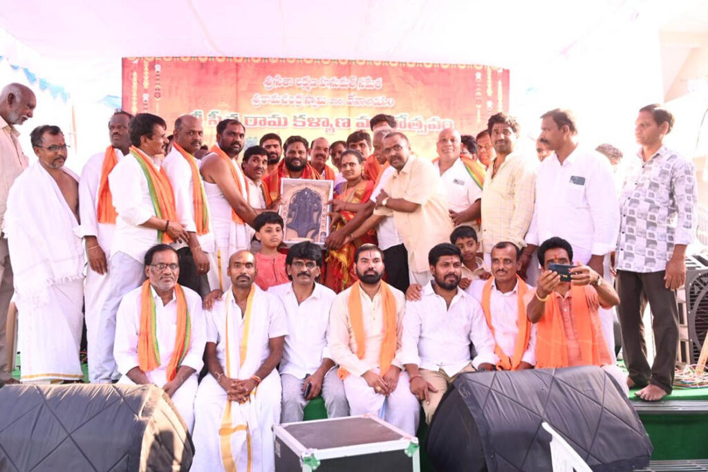 నీలం మధు ముదిరాజ్ దంపతులు తమ స్వగృహం నుంచి పట్టు వస్త్రాలను, ముత్యాల తలంబ్రాలను ఊరేగింపు గా తీసుకుని వచ్చి స్వామి వార్లకు సమర్పించి కళ్యాణ వేడుకలో పాల్గొన్నారు. సీతారాముల విగ్రహాలను చూడముచ్చటగా అలంకరించి ముత్యాల తలంబ్రాలతో సాగిన ఈ కల్యాణ ఘట్టం భక్తులకు కనువిందు చేసింది.ఈ మహత్తర కార్యక్రమానికి భక్తజనసంద్రం పెద్ద ఎత్తున హాజరై స్వామివారి కళ్యాణ మహోత్సవంలో భాగస్వాములు అయ్యారు. సీతారాముల కళ్యాణం సందర్భంగా ఏర్పాటుచేసిన సంగీత విభావరిలో గాయని భవాని ఆధ్వర్యంలో గాయకులు ఆలపించిన గీతాలు ఆహుతులను విశేషంగా అలరించాయి. ఆలయ ప్రాంగణమంతా జైశ్రీరామ్ నినాదాలతో మార్మోగి ఆధ్యాత్మిక శోభను సంతరించుకుంది.ప్రముఖ గాయని గాయకులు ఆలపించిన భక్తి పాటలకు మహిళలతో కలిసి నీలం మధు దంపతులు కోలాటం ఆడి ఉత్సాహం పెంచారు.