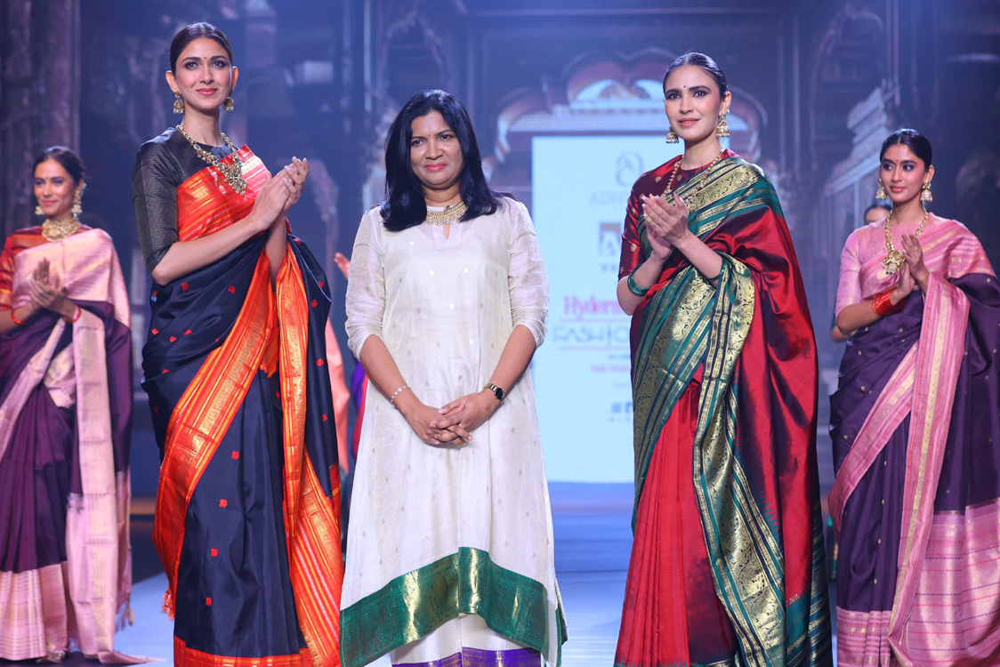 హైదరాబాద్ ఆధ్వరియా సిల్క్స్ డిజైనర్ దీప్తిరెడ్డి తీర్చిదిద్దిన కామాక్షి కలెక్షన్స్ లో మోడల్స్ చేసిన ఫ్యాషన్ షో కలర్ ఫుల్ గా సాగింది. ఆధ్వరియా సిల్క్స్ ఆధ్వర్యంలో కామాక్షి కలెక్షన్స్ ఫ్యాషన్ ప్రియులను ఎంతగానో ఆకట్టుకున్నాయి. డిజైనర్ దీప్తిరెడ్డి మాట్లాడుతూ ఆధ్వరియా సిల్క్స్ బ్రాండ్ పేరుతో “కామాక్షి కలెక్షన్స్” ఆవిష్కరించడం చాలా సంతోషంగా ఉంది. ఈ కలెక్షన్ వంశపారంపర్యమైన కంజీవరం చీరలను కలిగి ఉంటుంది, ప్రతి వస్త్రం క్లిష్టమైన రూపకల్పన మరియు విలాసవంతమైన కళాఖండం, పాతకాలపు రంగుల ప్యాలెట్ల నుండి ప్రేరణ పొందింది, మన తెలుగు సంప్రదాయం మరియు చక్కదనం యొక్క క్లాసిక్ తో పెళ్లి కి ఎంగేజ్మెంట్ ప్రతి పంక్షన్ కి తెలుగు ధనమ్ ఉట్టిపడేలా ఈ కామాక్షి కలెక్షన్స్ తీర్చిదిద్దాం అని తెలిపారు.