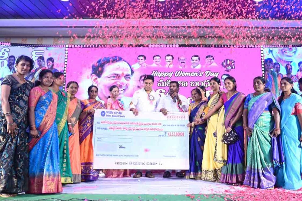 మహిళా సంక్షేమంతో పాటు మహిళల భద్రతకు పెద్దపీట వేసిన ఏకైక ముఖ్యమంత్రి కేసీఆర్ అన్నారు. దేశంలో ఎక్కడా లేని విధంగా తెలంగాణ రాష్ట్రంలో పేదింటి యువతుల వివాహం కోసం కల్యాణ లక్ష్మి, షాదీ ముబారక్ పథకాలను ప్రవేశపెట్టడం జరిగిందన్నారు. లింగ వివక్ష లేని సమాజం నిర్మాణం కావలసిన ఆవశ్యకత ఎంతైనా ఉందన్నారు. ఈ సందర్భంగా పటాన్చెరు నియోజకవర్గ పరిధిలోని మహిళా సంఘాలకు 2021-2022 సంవత్సరానికి సంబంధించిన 42 కోట్ల 53 లక్షల రూపాయల విలువైన స్త్రీ నిధి రుణాలకు సంబంధించిన చెక్కును మంత్రి కేటీఆర్ చేతులమీదుగా మహిళా సంఘాలకు అందజేశారు. ఈ ఈ కార్యక్రమంలో జిల్లా పరిషత్ చైర్పర్సన్ మంజు శ్రీ జైపాల్ రెడ్డి, జిల్లా కలెక్టర్ హనుమంతరావు, నియోజకవర్గ ప్రజాప్రతినిధులు, అన్ని శాఖల మహిళా ఉద్యోగులు, విద్యార్థినిలు, మహిళలు పెద్ద సంఖ్యలో పాల్గొన్నారు.
